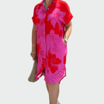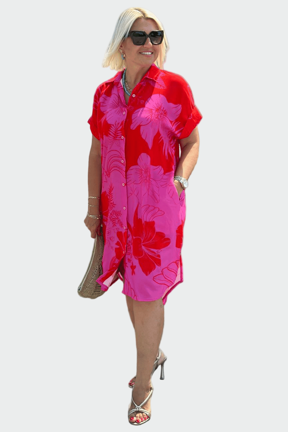 Šaty s květinovým vzorem přinášejí vaše léta svěžest a radost z nošení. Kombinace sytě červené a jemně růžové s výraznými květinovými motivy vytváří veselý a okouzlující vzhled, který skvěle ladí s letními výpravami a procházkami.