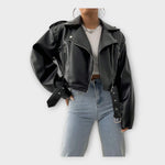 Elegantní a nadčasový kousek do šatníku: krátká kožená bunda se páskem . Tento kousek se snadno přizpůsobí každému stylu, dodává perfektní finální tečku každému outfitu a kombinuje praktičnost s lehkou rafinovaností.